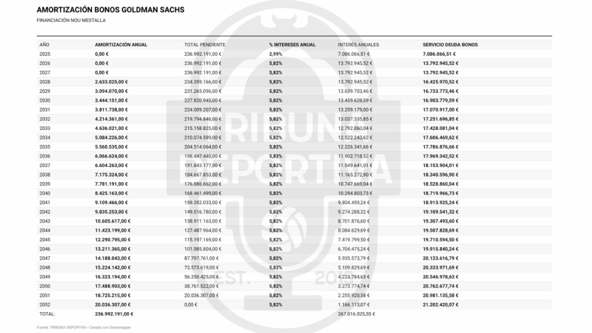 El club contará con un periodo de carencia hasta que el nuevo estadio entre en funcionamiento, motivo por el cual no comenzará a amortizar el principal hasta septiembre de 2028 (los intereses, en cambio, se abonarán desde septiembre de 2025). La devolución será progresiva: arrancará con un primer pago de 2,6 millones, que irá aumentando conforme se reduzca la carga de intereses. El último vencimiento, previsto para 2052, será el más elevado, con 20,03 millones más intereses.